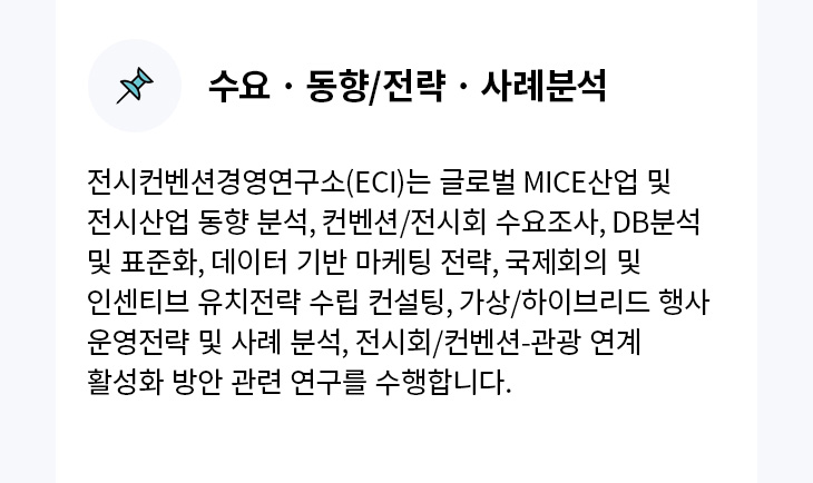 전시컨벤션경영연구소(주)   l   대표자  : 이창현   l   이메일  : eci@eci.re.kr   l   전화번호  : 02-3213-8145  /  팩스 : 02-3213-8118