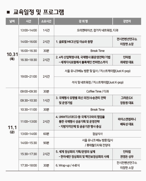 두 차례에 걸쳐 서로 다른 커리큘럼으로 진행함. 보다 국제행사 개최 경험이 풍부한 선도기업의 실제 행사운영 사례를