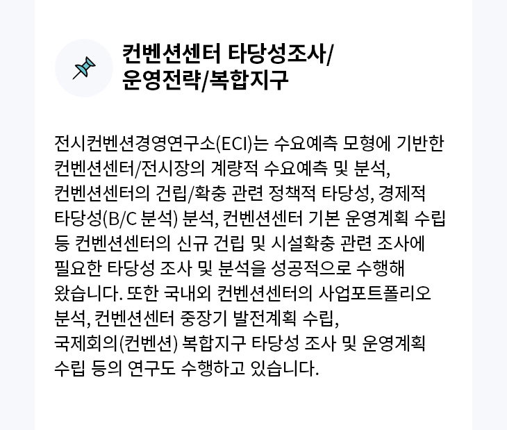 전시컨벤션경영연구소(주)   l   대표자  : 이창현   l   이메일  : eci@eci.re.kr   l   전화번호  : 02-3213-8145  /  팩스 : 02-3213-8118