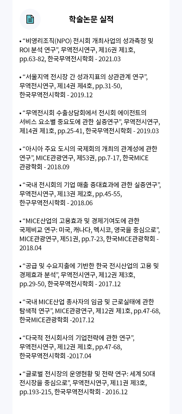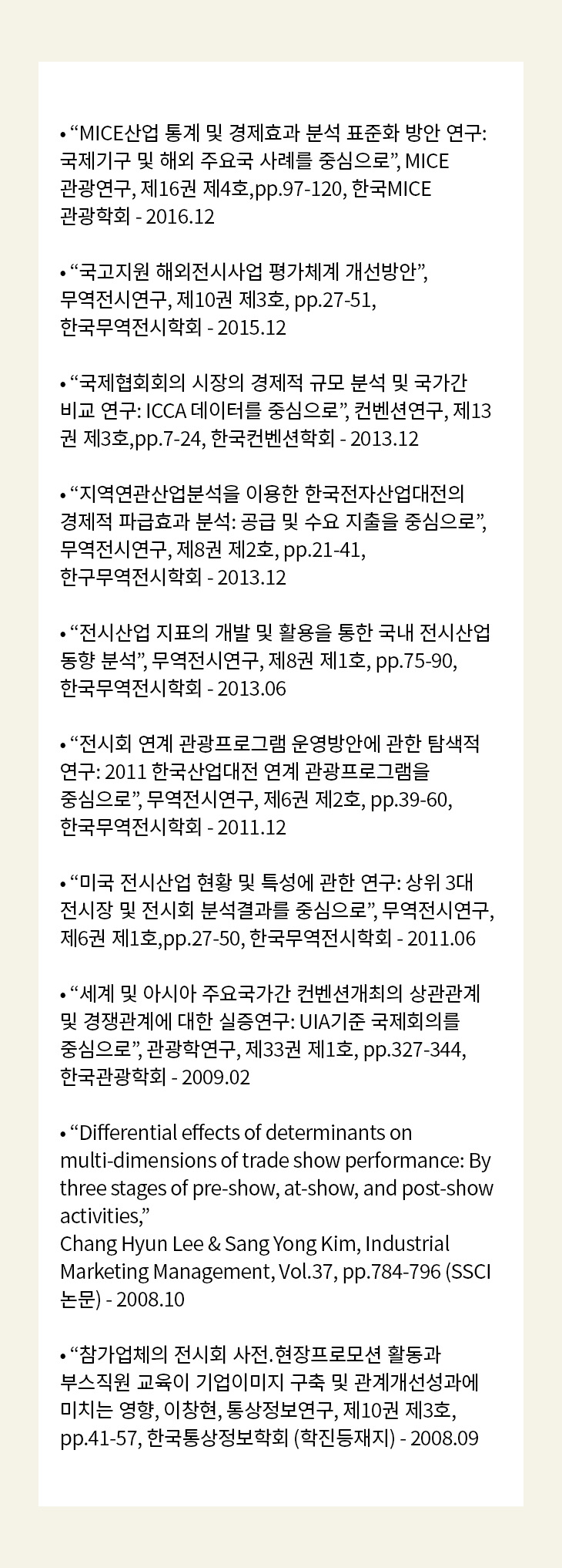 전시회 성과측정, ROI 분석, 경제적 파급효과 분석 등 실증적 연구를 통해 MICE 산업의 고도화와 정책 수립에 필요한 학문적 근거를 제시하고 있습니다.