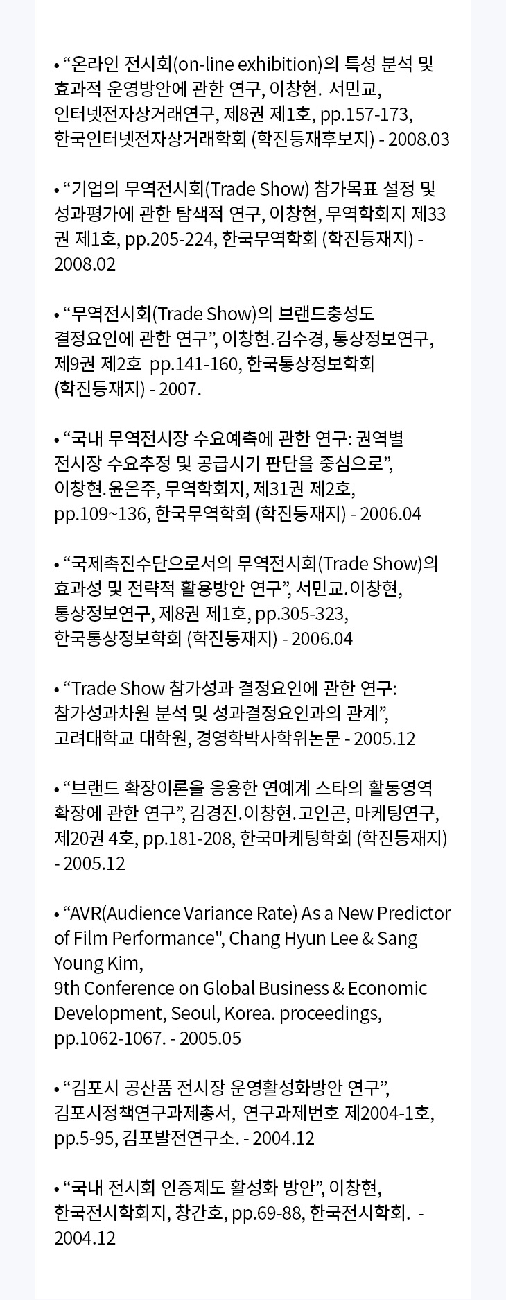 | “Trade Show 참가성과 결정요인에 관한 연구: 참가성과차원 분석 및 성과결정요인과의 관계”, 고려대학교 대학원, 경영학박사학위논문 | 2005.12 |