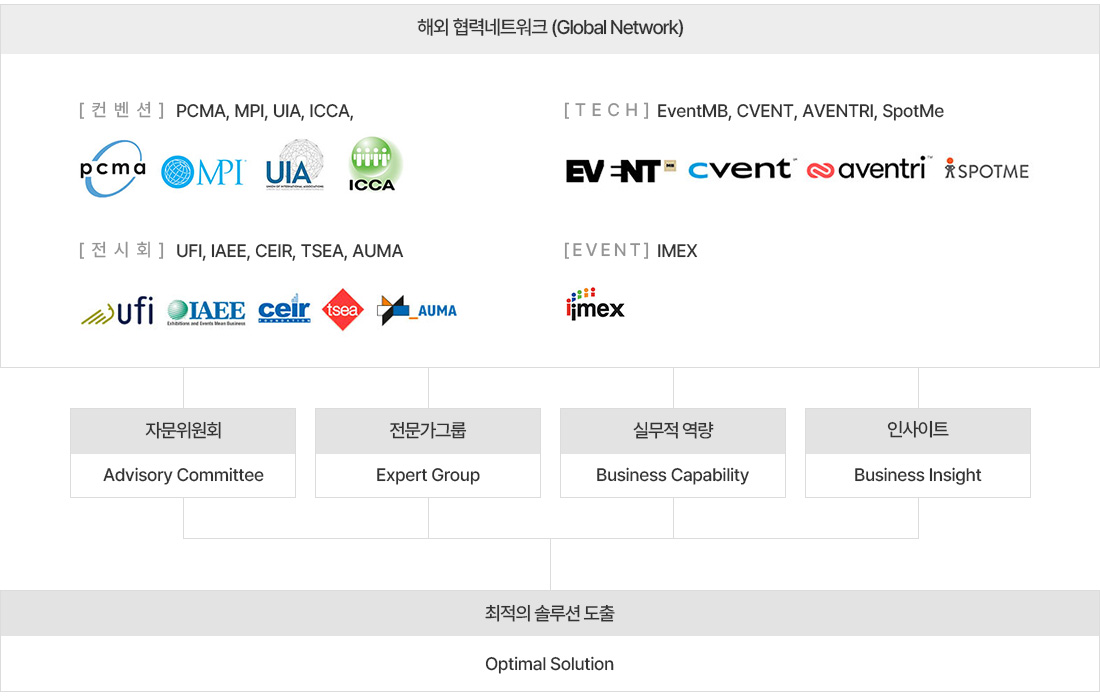 전시컨벤션경영연구소(ECI, Exhibition & Convention Institute)는 해외 주요 전시컨벤션 기관/기업과의 협력 네트워크를 구축하고, 최고 경력의 전시컨벤션 위원을 중심으로 자문위원회(Advisory Committee) 운영, 실무경험과 역량이 높은 전문가그룹(Expert Group) 운영 등을 통해 전시컨벤션 분야 최신의 글 로벌 지식과 정보, 오랜 기간 누적된 경험을 통한 인사이트(Insight), 현장에서의 실제적 적용을 돕는 실무적 역량(Capability)을 유기적으로 결합하여 최적의 솔루션(Solution)을 도출합니다.
