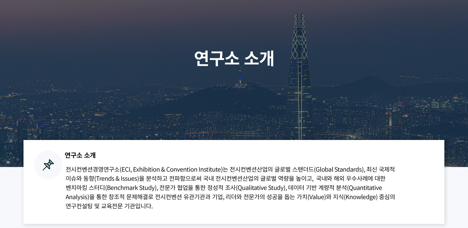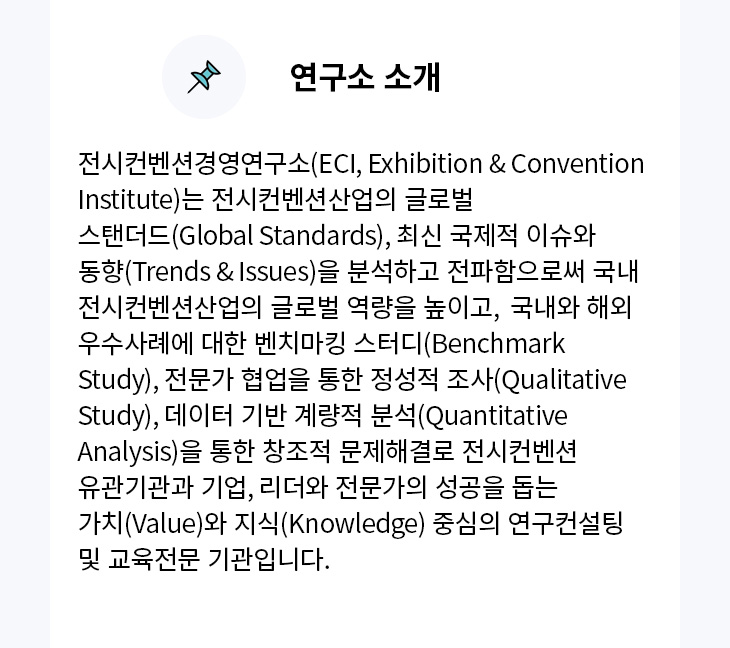 전시컨벤션경영연구소(ECI, Exhibition & Convention Institute)는 해외 주요 전시컨벤션 기관/기업과의 협력 네트워크를 구축하고, 최고 경력의 전시컨벤션 위원을 중심으로 한 자문위원회(Advisory Committee) 운영, 실무경험과 역량이 높은 전문가그룹(Expert Group) 운영 등을 통해 전시컨벤션 분야 최신의 글로벌 지식과 정보, 오랜 기간 누적된 경험을 통한 인사이트(Insight), 현장에서의 실제적 적용을 돕는 실무적 역량(Capability)을 유기적으로 결합하여 최적의 솔루션(Solution)을 도출합니다.