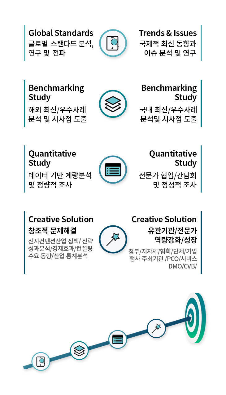 - 학술연구용역 - 전문 콘텐츠 개발, 보고서 발간 - 전시컨벤션 연구 및 컨설팅 - 전시컨벤션 플랫폼 구축 및 운영 - 전시컨벤션 교육과정 개발/운영 - 전시마케팅 솔루션 개발 및 운영