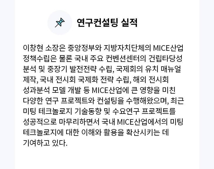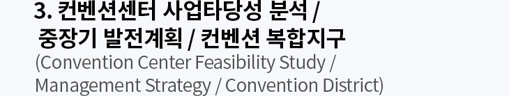 중앙정부와 지자체의 MICE 정책수립, 컨벤션센터 건립타당성 분석, 국제화 전략 수립 등 업계에 큰 영향을 미친 다수의 핵심 프로젝트를 성공적으로 수행해왔습니다.