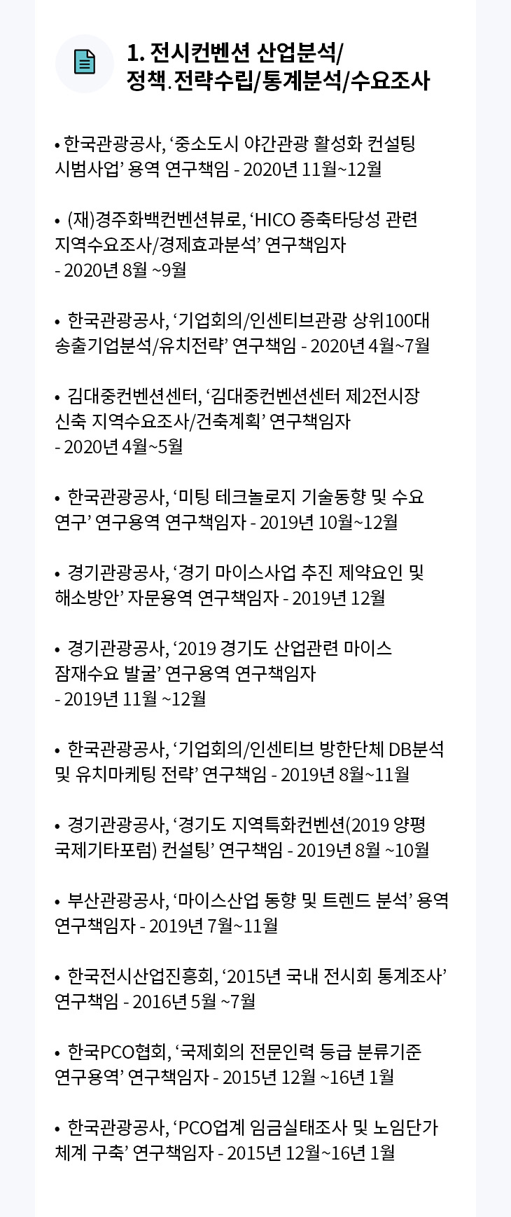 | 한국관광공사 국제회의 유치 매뉴얼 리뉴얼 제작 용역 연구책임자 | 2019.03 ~ 05 |