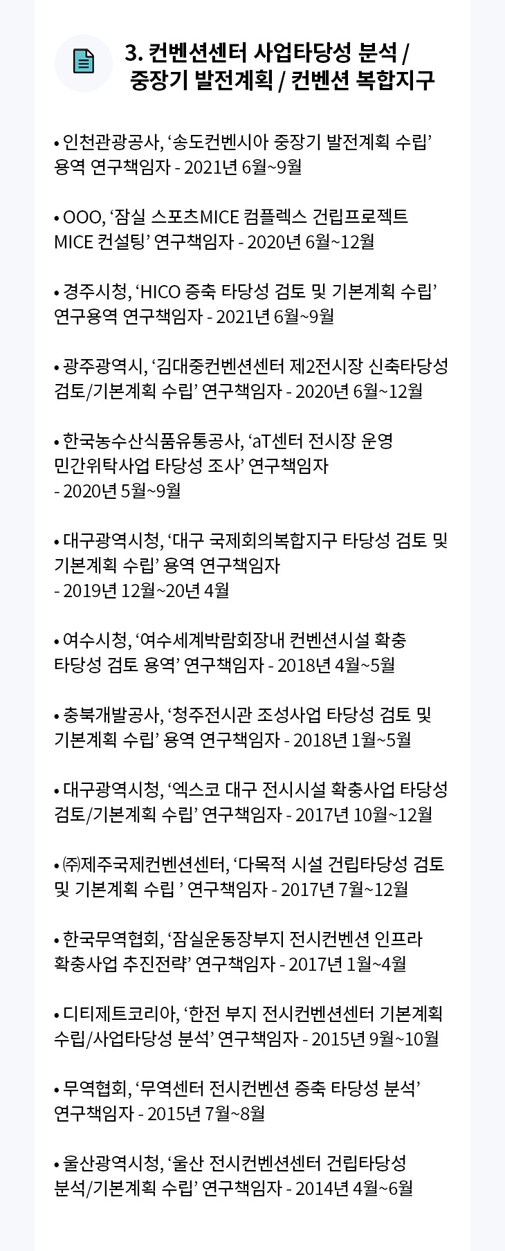 | 인천관광공사 송도컨벤시아 중장기 발전계획 수립 용역 연구책임자 | 2021.06 ~ 09 |
