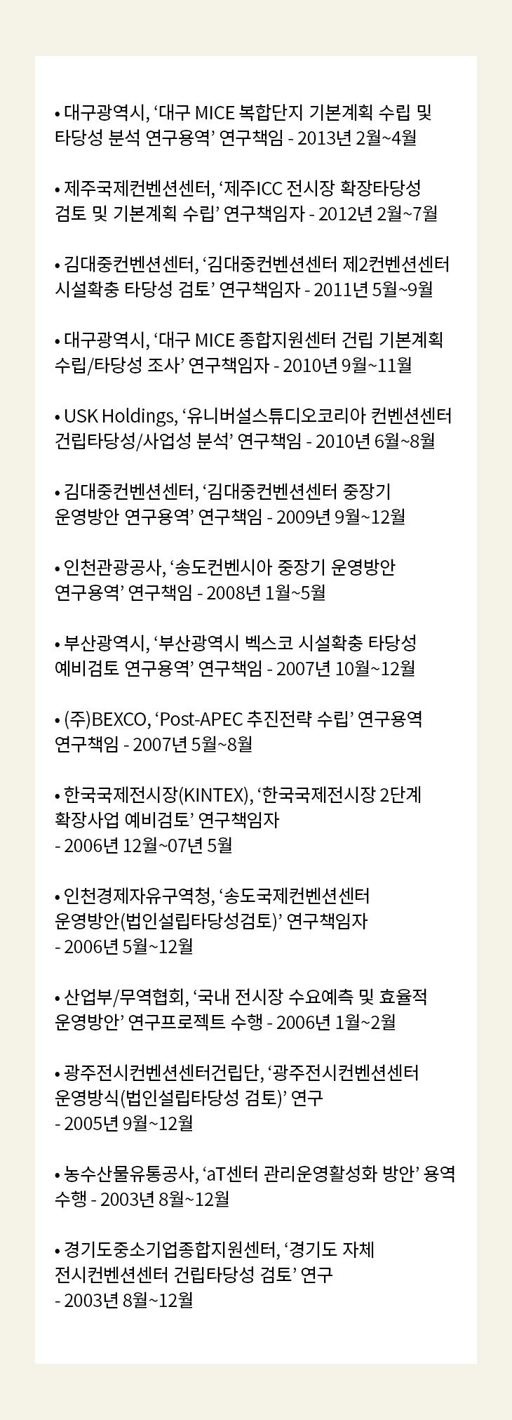 | 한국전시산업진흥회 한국의 전시산업 발간사업 연구책임자 | 2006.05 ~ 11 |