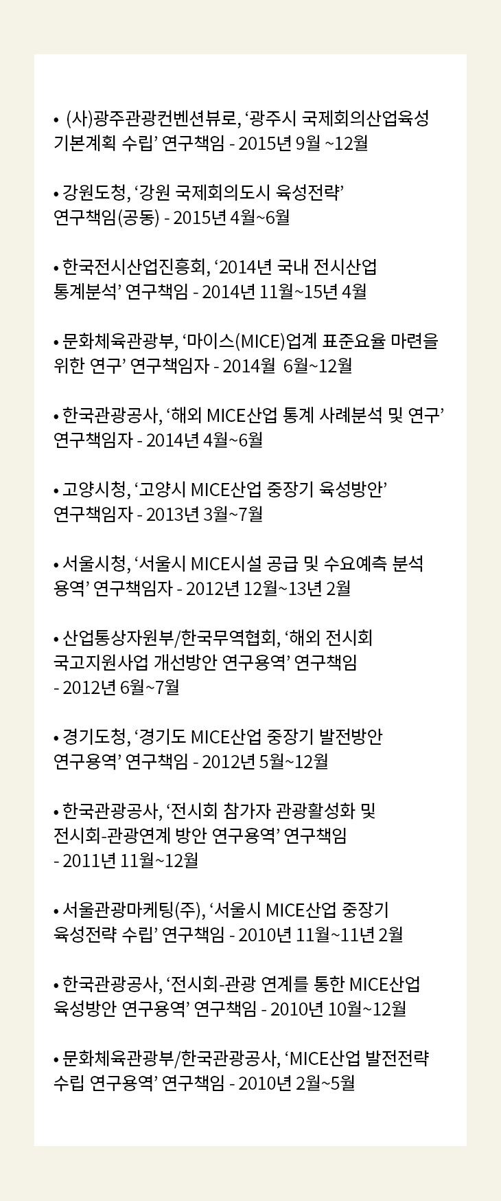 | (사)광주관광컨벤션뷰로 광주시 국제회의산업육성 기본계획 수립 연구책임 | 2015.09 ~ 12 |