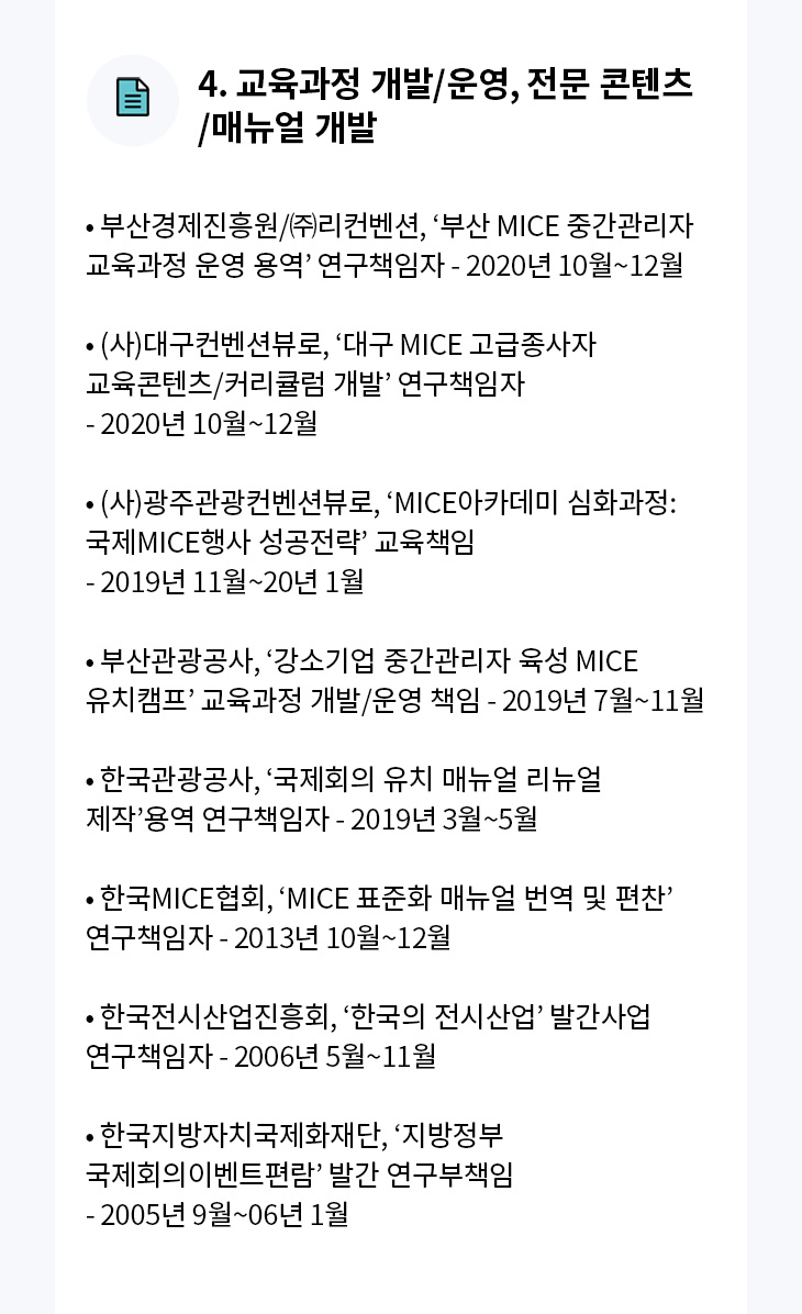 | 부산경제진흥원/(주)리컨벤션 부산 MICE 중간관리자 교육과정 운영 용역 연구책임자 | 2020.10 ~ 12 |