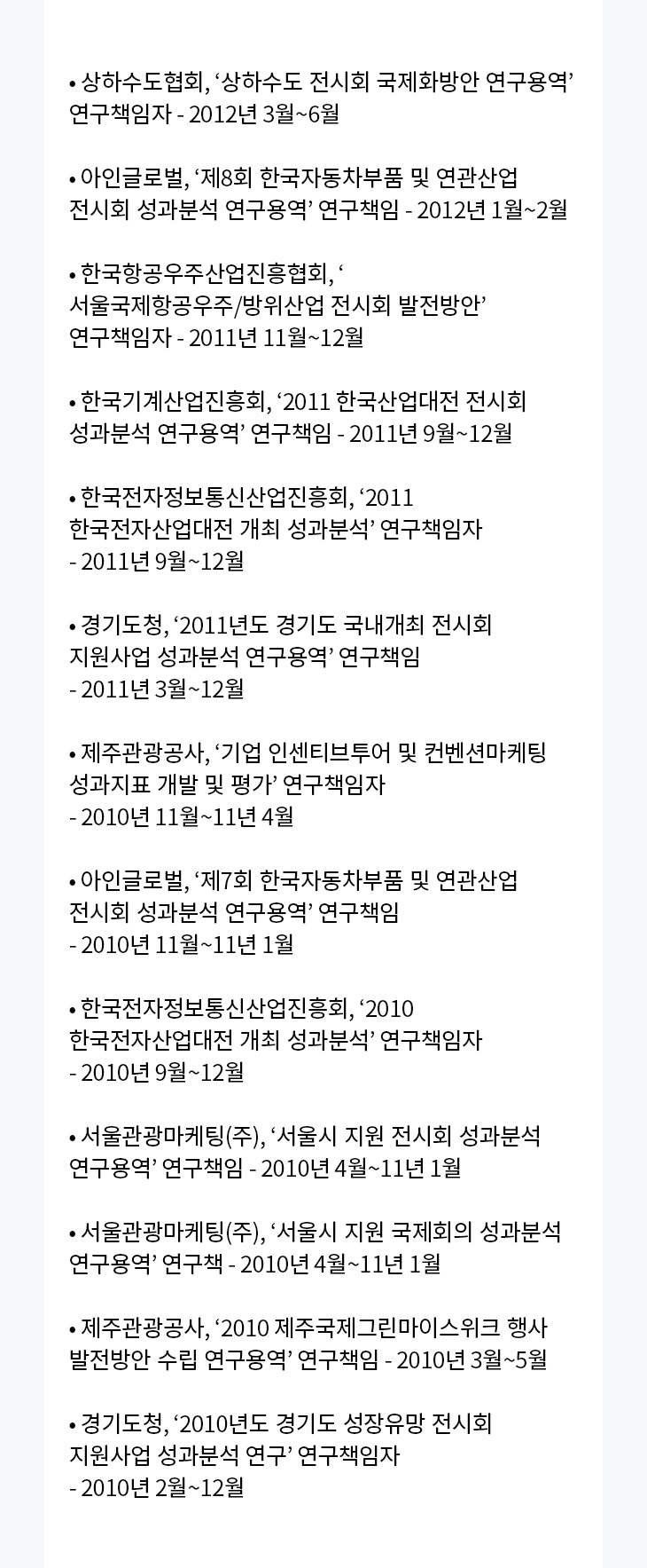 | 한국전시산업진흥회 2014년 국내 전시산업 통계분석 연구책임 | 2014.11 ~ 15.04 |