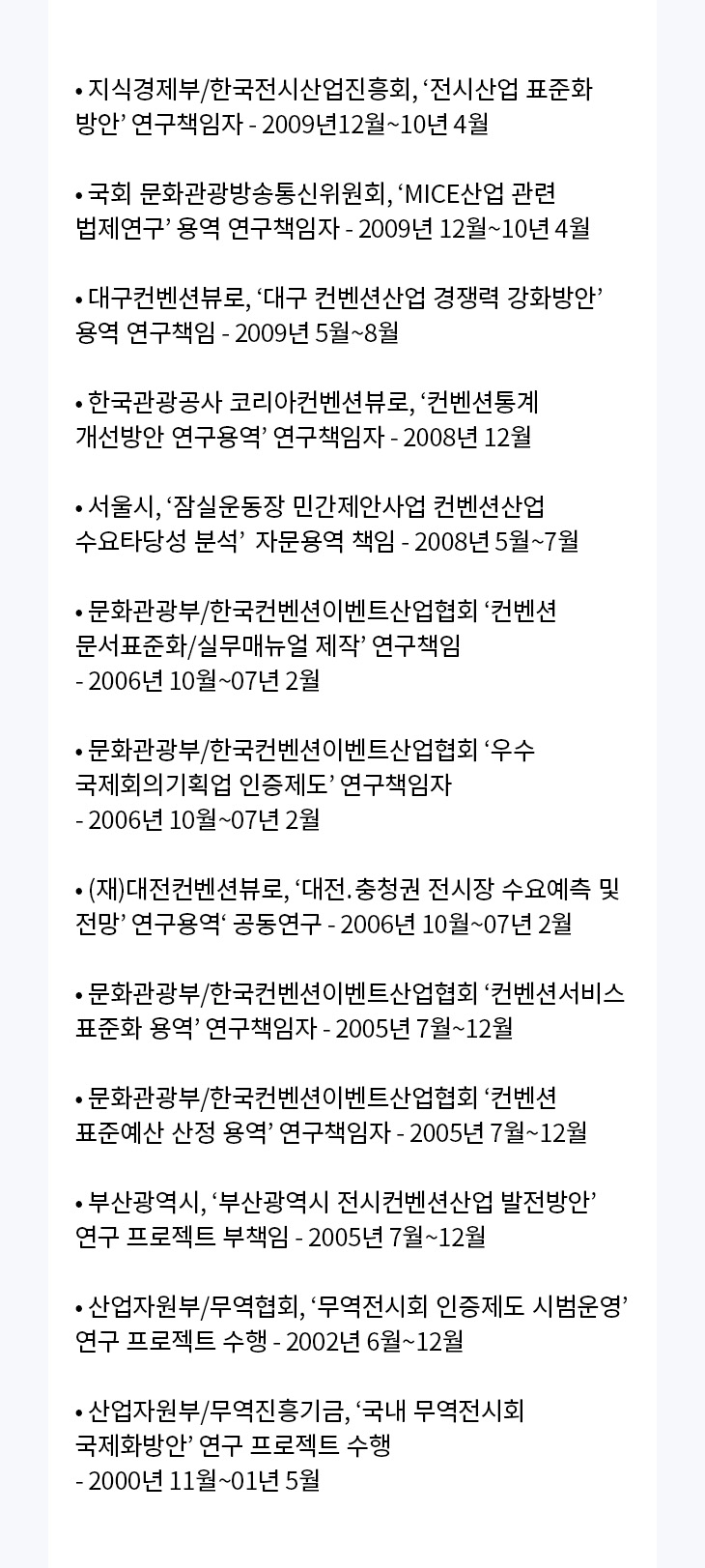 | 문화관광부/한국컨벤션이벤트산업협회 컨벤션서비스 표준화 용역 연구책임자 | 2005.07 ~ 12 |